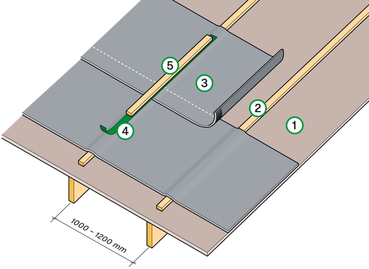 Det befintliga fasta taket (1) förses först med ströläkt (2) i minst dimension 22 x 45 mm med c-avstånd 1000- 1200 mm som kan liknas med överkanter på takstolar. För att beakta bärigheten av det nya läktade yttertaket placera ströläkten rakt över de gamla underliggande takbjälkarna. Var noga och väg av nivån på läkterna mot det gamla underlaget och rikta vid behov.