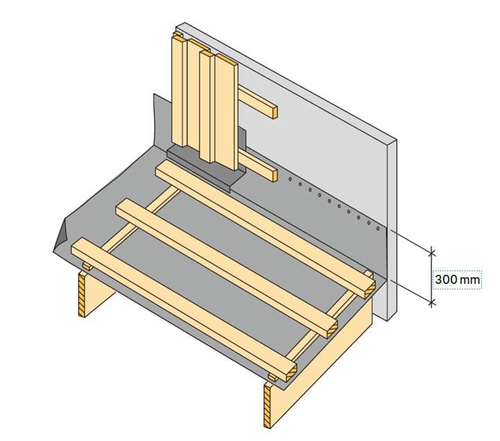 Underlagstaket dras upp minst 300 mm och fästs med varmförzinkad takpappspik minst 20 x 2,8 mm, c-avstånd 80 mm.