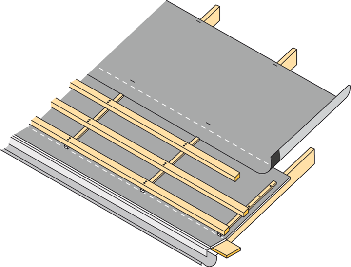 Spikläkten infästs tillkapade på ömse sidor mot takstol i samma liv och lodräta linje. Rulla ut den tillskurna våden längs med den övre kanten av alla stödreglar. Infäst (spika/klamra) på ovansidan mot dessa. Sträck ned våden längs tak fallet och skär till/slitsa för var takstol. Vik ner och fäst/täta med T-Butyl Skarvband mot spikläkten hela vägen nerifrån och upp.
