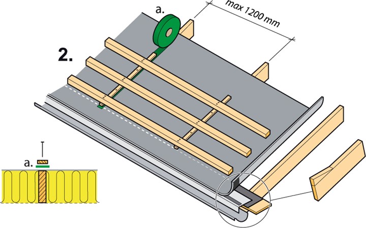 För att uppnå täthet under varje ströläkt klistras TECCA Läkttätningsband (a.) över respektive takstol mot duken. Längder efter ströläktens. Infäst sedan ströläkten över bandet i takstolen med varmförzinkad trådspik 63 x 2,8 mm c-avstånd 300 mm. Bärläkten (min 45 x 70 mm) infästs därefter med 2 x varmförzinkad spik 100 x 34 mm vid varje takstolsfästpunkt.