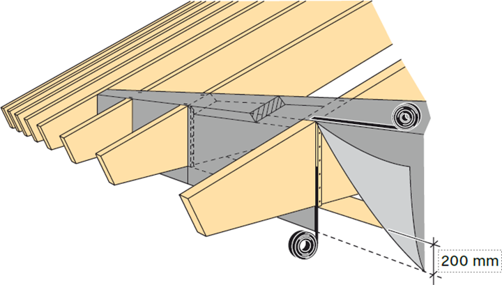 Som skyddande övergång mellan gavelspetsen och underlagstaket monteras en remsa av detsamma (ca 300 mm). Remsan skall dras från och med samt över närmaste undre beklädnadsbrädan på gavelspetsen in minst över underlagstaket 200 mm.