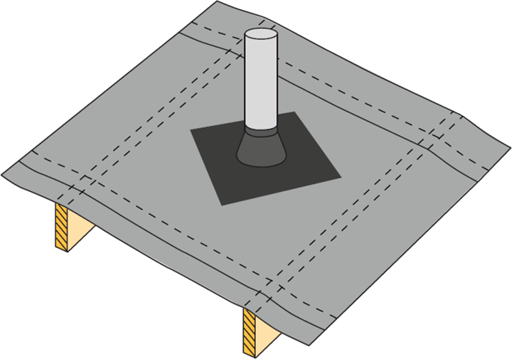 Gummidamasken skall krängas över röret och den klistrande kragen tryckas noga fast mot underlaget med ett hörn vinklat upp mot nocken.