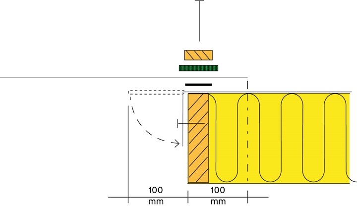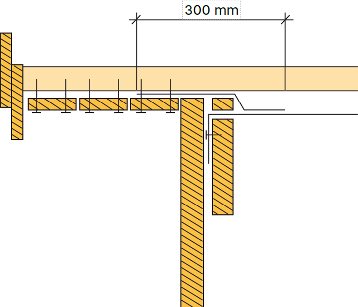 På ovansidan närmast kanten appliceras ett skarvband längs hela stödet som tätning mot ovan kommande underlagstak. Skyddsfolien på skarvbandet kan sparas på dess utsida för att slutligen avlägsnas när väl infästning och tätning sker. Beakta önskvärt god ventilering under byggtiden!