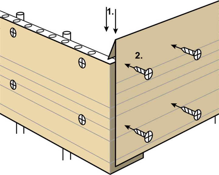 Gjutskivan ska alltid vikas dubbelt i överkant så att skruven som fästs i den översta distanslisten alltid går genom två lager wellpapp. Minsta rekommenderade nedvik är översta vikanvisningen på skivan (100 mm).