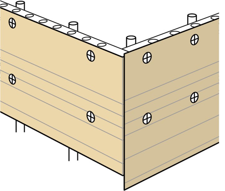 Infästningen som rekommenderas är monteringsskruv (min 40 mm), farmarskruv (min 40 mm) alternativt skruv och bricka (TECCA art.nr 296015). Skivan monteras med max 400 mm mellan infästningspunkterna. Skruven skall fästas i distanslisten, genom wellpappen. Placera skruven så nära distanslistens mitt som möjligt (utan att träffa hålen i distanslisten) och fäst in i varje distanslist.