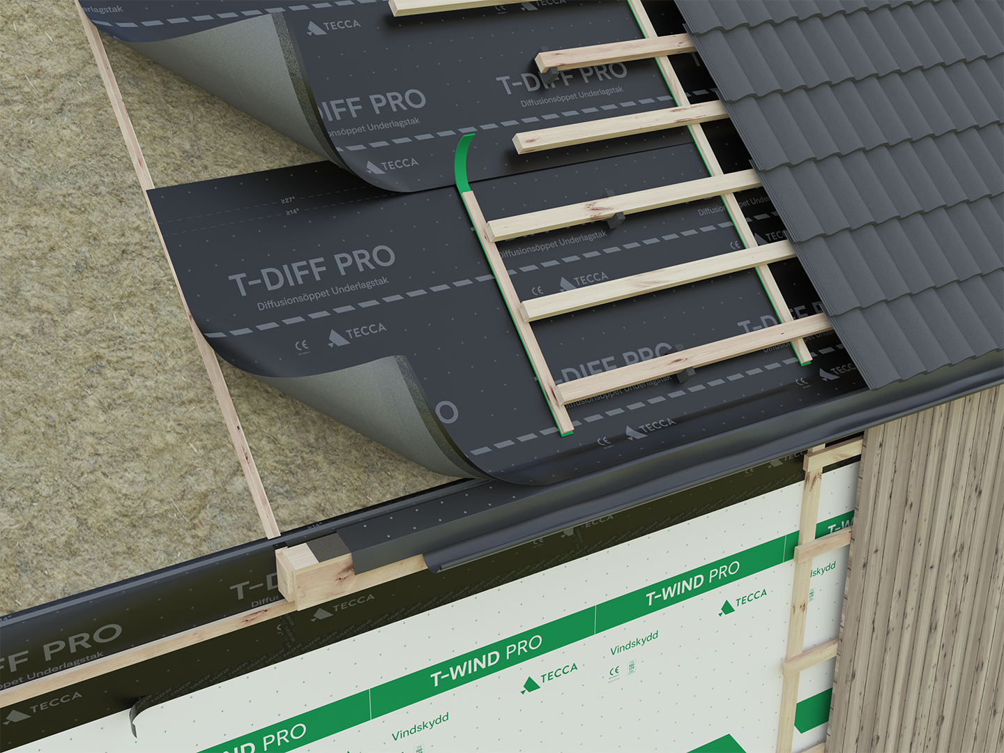 Hängande, vattenavledande underlagstak med diffussionsöppna egenskaper som möjliggör isolering mot undersidan utan luftspalt.