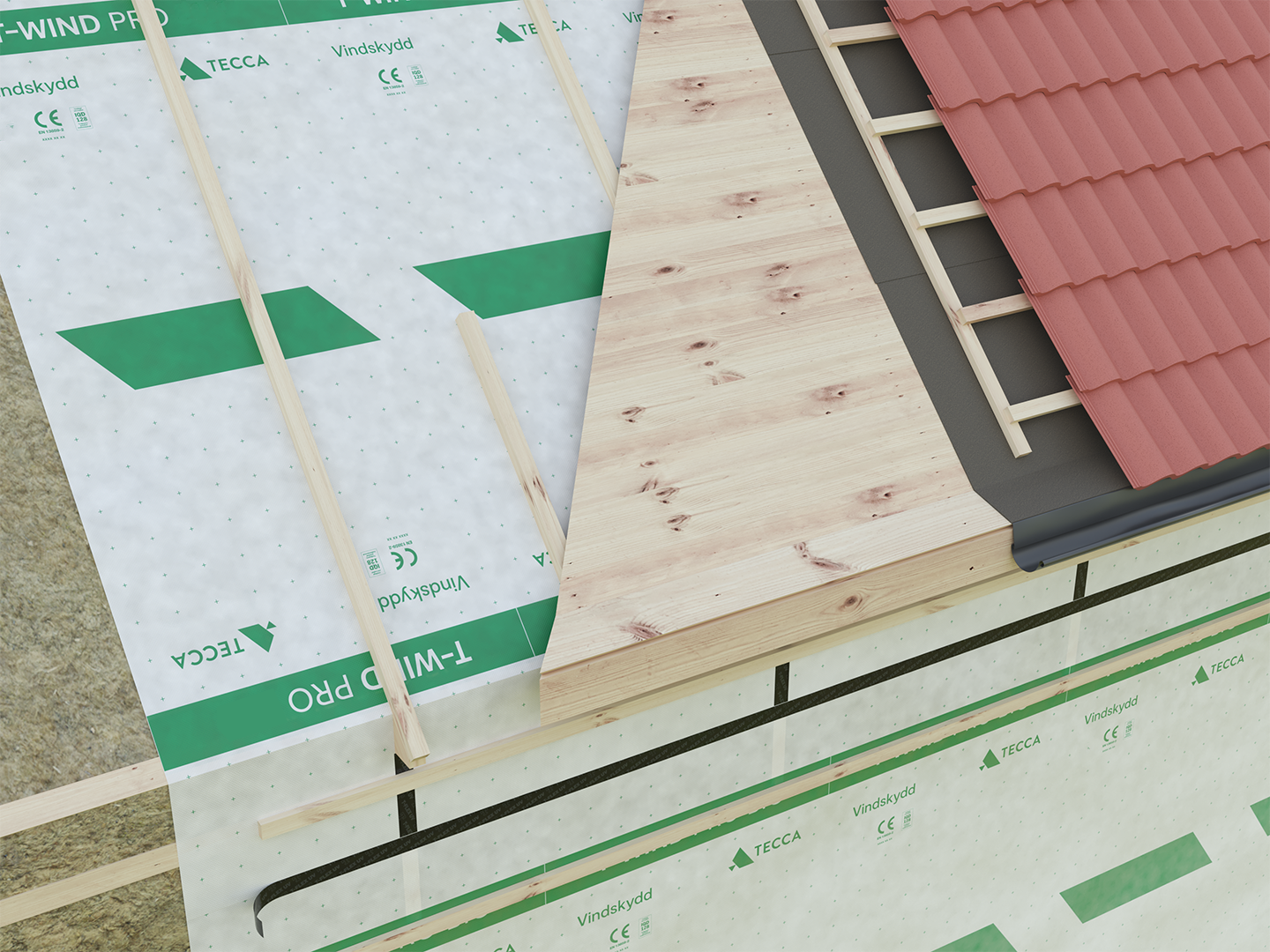 Vindskydd i tak med T-Wind är ett system som skapar ett vindtätt och diffusionsöppet skal (utvändig klimatskärm tak) och bildar även en luftspalt mot yttertakets träunderlag.