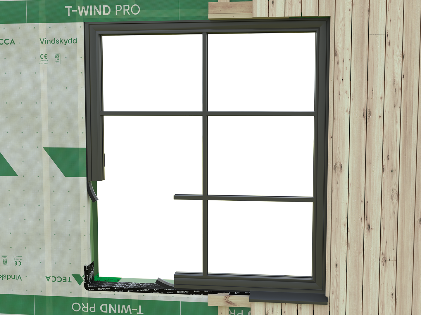 För att komplettera hörnen i den invändiga klimatskärmen används Tätningstejp T-Flex eller T-Flex ark på de delar där material saknas.