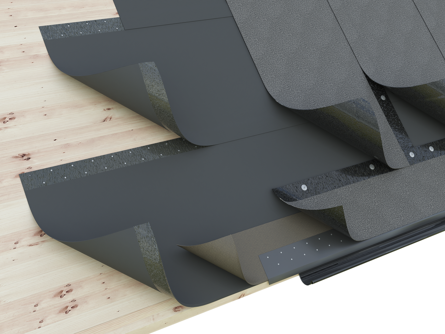 Här ser du en beskrivning av underlagsdukens placering och överlapp. Våderna läggs från höger till vänster och läggs enklast nedifrån och upp. Mellan underlagsduken och plåten läggs en skyddande remsa av YEP 2500 för att förhindra att fukten tar sig in.