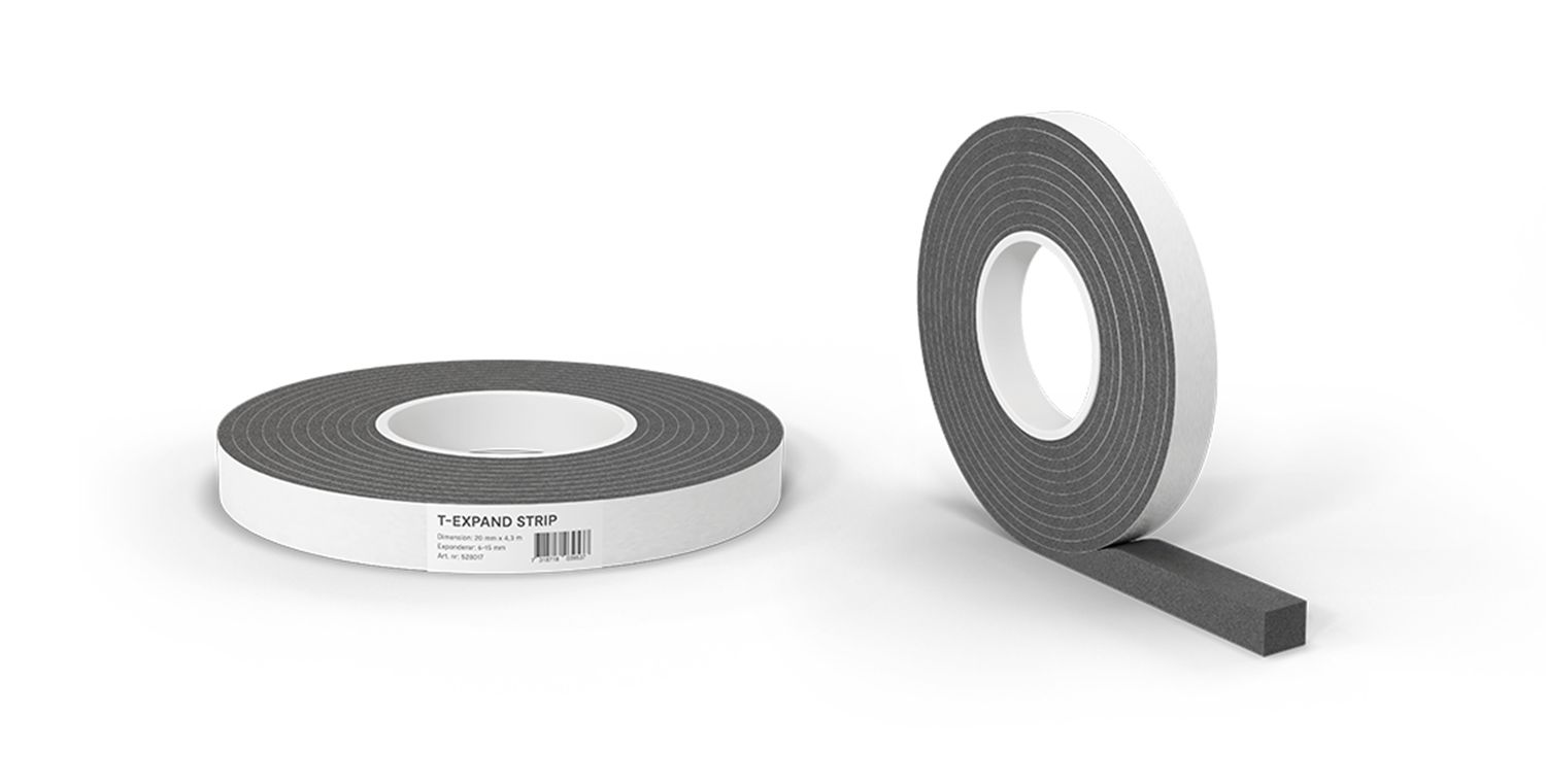 T-Expand Strip är ett fogband av impregnerat PUR (Polyuretan) samt undersida med klisterremsa för snabb och enkel montering. Utvändig sida diffusionsöppen men slagregnsskyddad vattentät upp till 600 Pa. För fogning och tätning primärt utvändigt i fasader eller stommar. Fogbandet ger en diffusionsöppen vädersäker utsida. Fungerar mot underlag som trä, stål, plåt, betong och flertalet plaster.