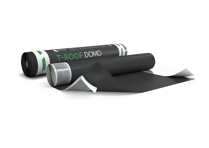 T-Roof Domo är uppbyggd av en mineralfiltstomme belagd med SBS-bitumen och polypropenfilt. Klisterkanter av bitumen med skyddsfolie, folien avlägsnas vid skarvning och montering.